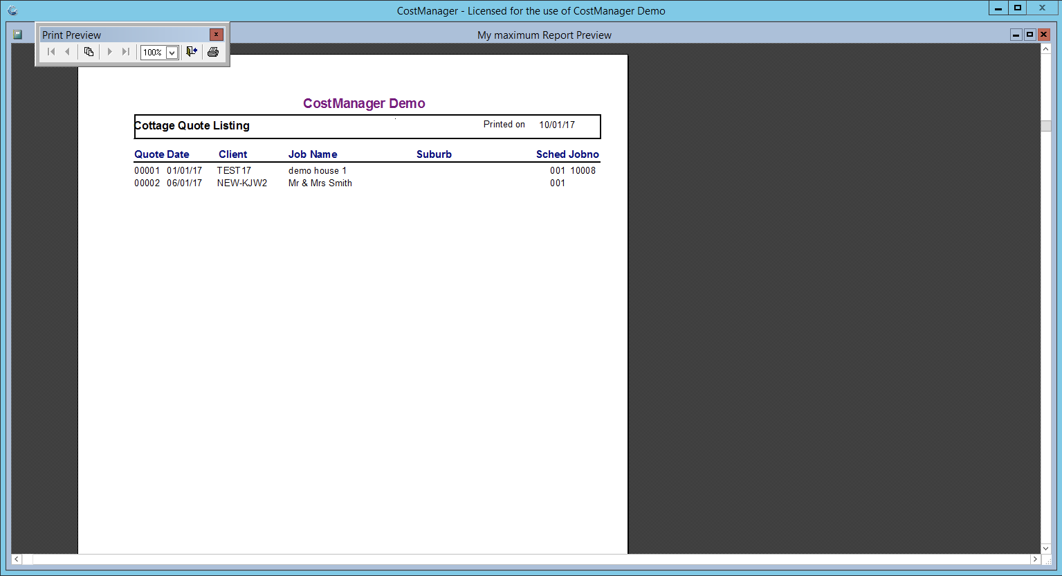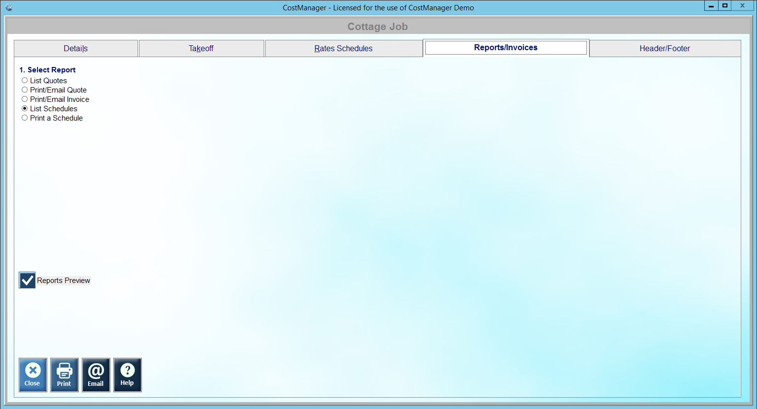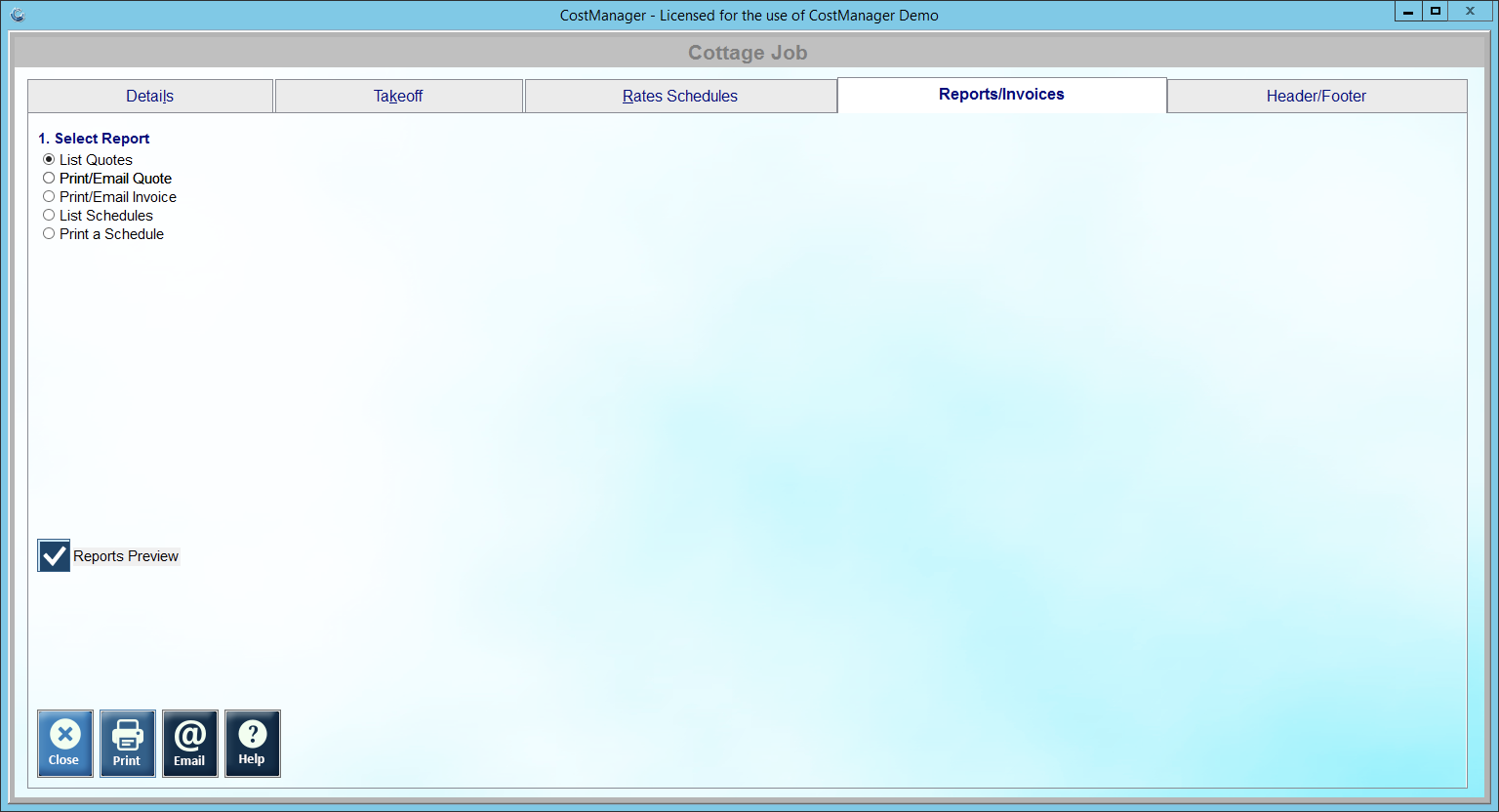1: List Quotes - (1) Select List Quotes (reports preview ticked), then click print. If you do not want to print click ESC.