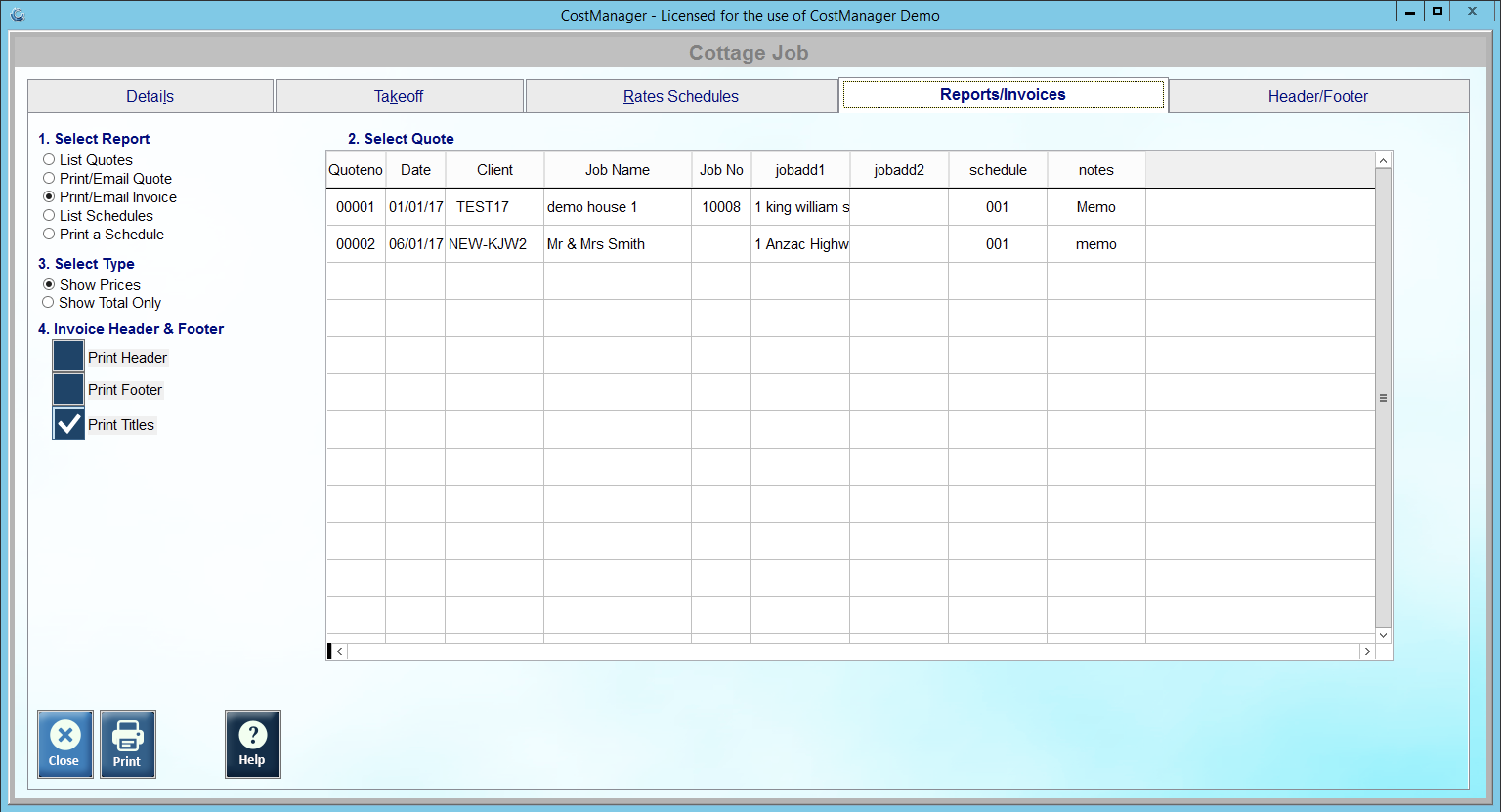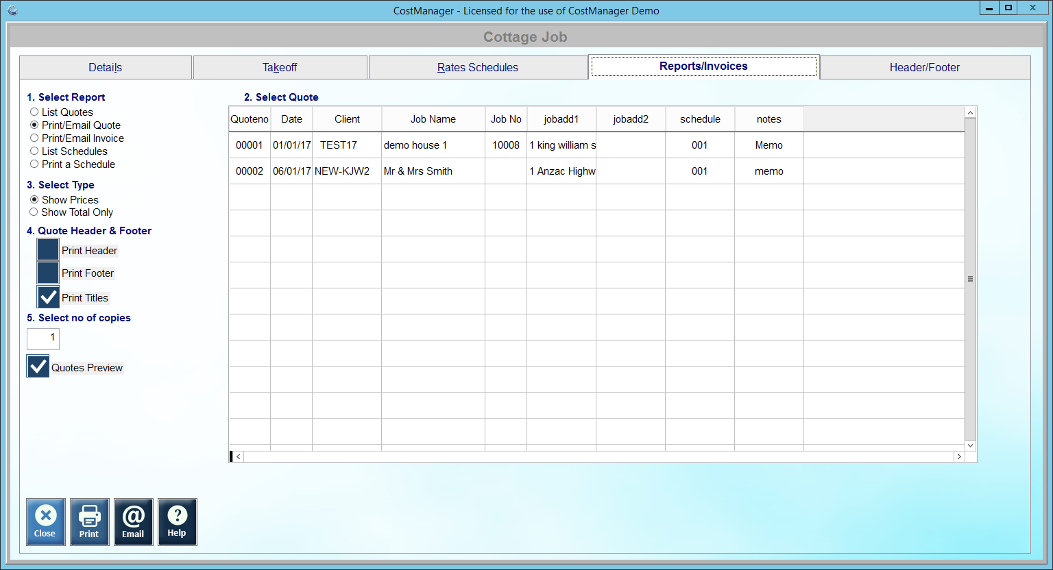 3: Print/Email Invoice - (1) Select Print/Email Invoice, (2) Select Quote No, (3) Select Type required, (4) Select Quote Header & Footer, Click Print to bring up Cottage System Invoice screen.